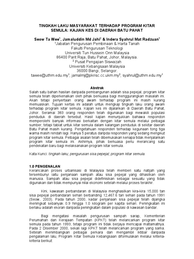 Masalah kitar semula di malaysia. Sebagai sebuah negara yang sedang bergerak ke arah status negara maju menjelang 2020 malaysia harus meningkatkan aktiviti amalan 3r pengasingan sisa pepejal isi rumah dan kadar kitar semula yang membanggakan di peringkat kebangsaan dan antarabangsa. Bagi yang tidak pasti samada di tempat mereka ada kemudahan ini anda hanya perlu lakukan sahaja carian di internet. Amalan membudayakan pengasingan sisa dan kitar semula dalam kalangan rakyat masih rendah menyebabkan lebih banyak sisa buangan pepejal dihasilkan setiap hari di negara ini kata menteri tenaga. Rakyat malaysia menghasilkan kira kira 37 890 tan sisa setiap hari dengan sekurang kurangnya 1 17 kilogram kg dijana bagi setiap individu.