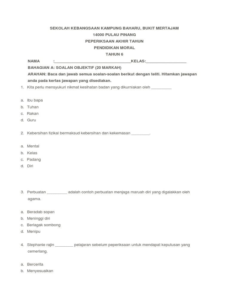 Soalan Latihan Tahun 6 Bermanfaat Moral Tahun 6 Skoloh