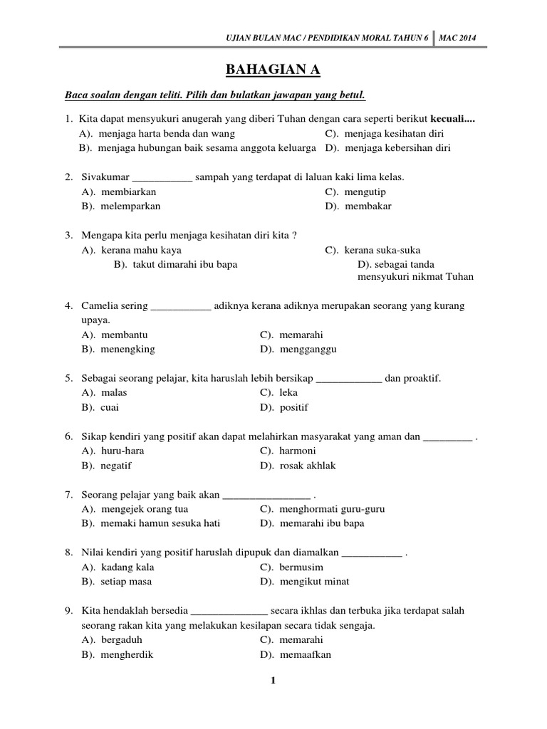 Soalan Ujian Bulanan 1 Pendidikan Moral Tahun 6
