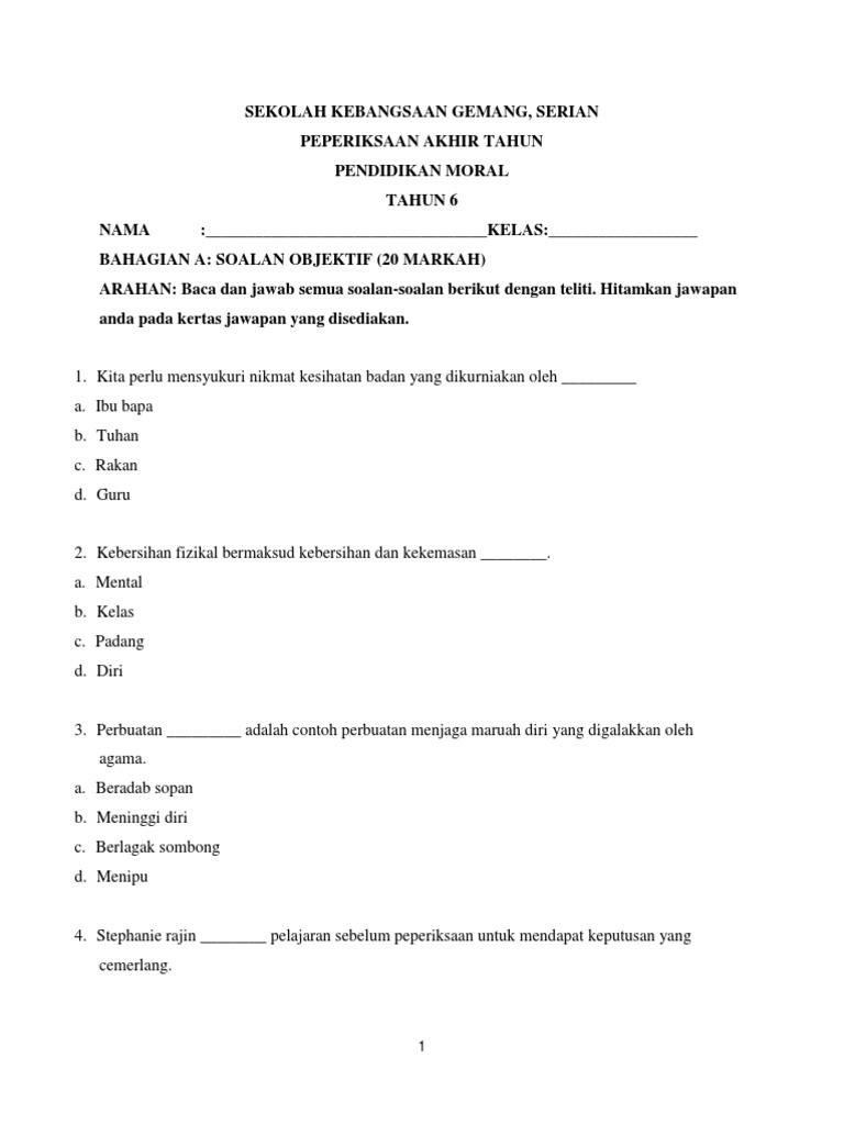 Contoh Soalan Pendidikan Moral Tahun 1 Kssr Tersoal P