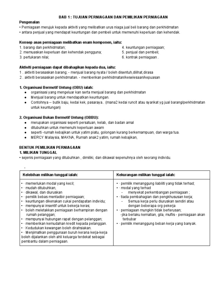 Nota Bab 1 Tujuan Perniagaan Dan Pemilikan Perniagaan Lucky Potato