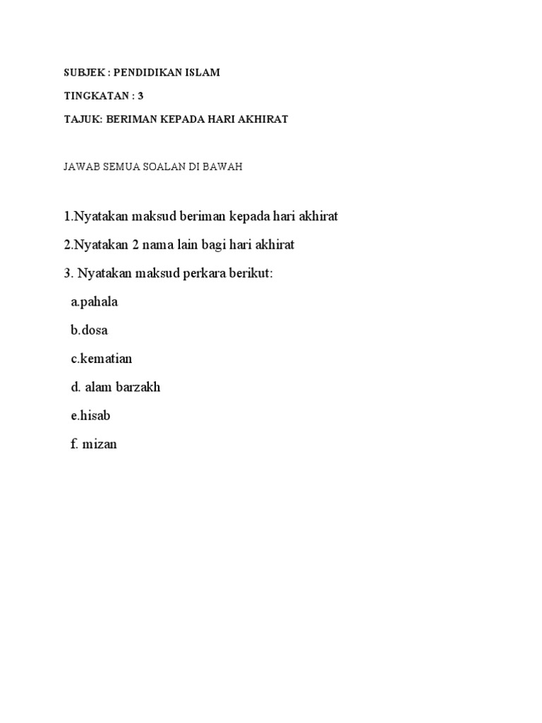 1 Nyatakan Maksud Beriman Kepada Hari Akhirat 2 Nyatakan 2 Nama Lain Bagi Hari Akhirat 3 Nyatakan Maksud Perkara Berikut A Pahala B Dosa C Kematian D Alam Barzakh E Hisab F Mizan