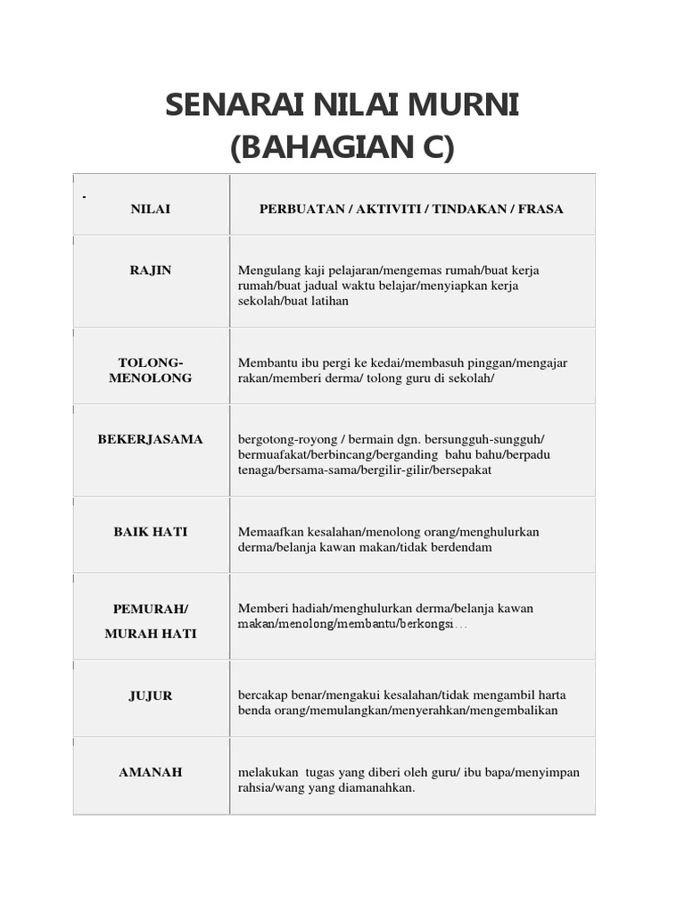 Senarai Nilai Murni Untuk Penulisan Bahagian C