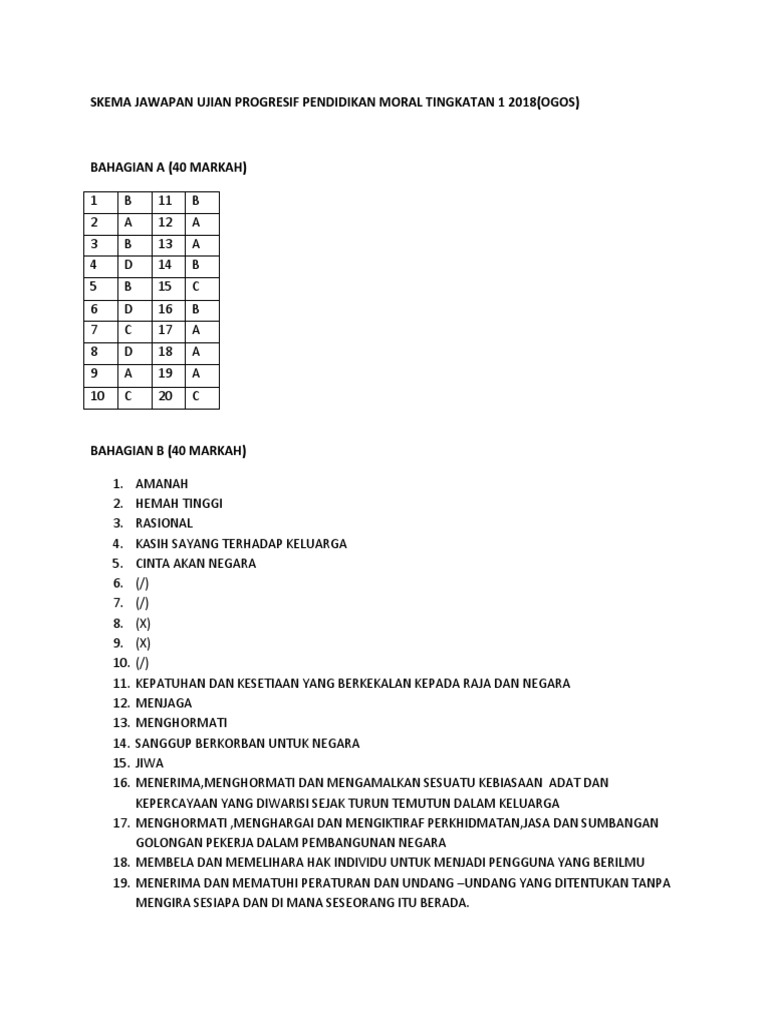 Skema Jawapan Ujian Progresif Pendidikan Moral Tingkatan 1 2018 Ogos