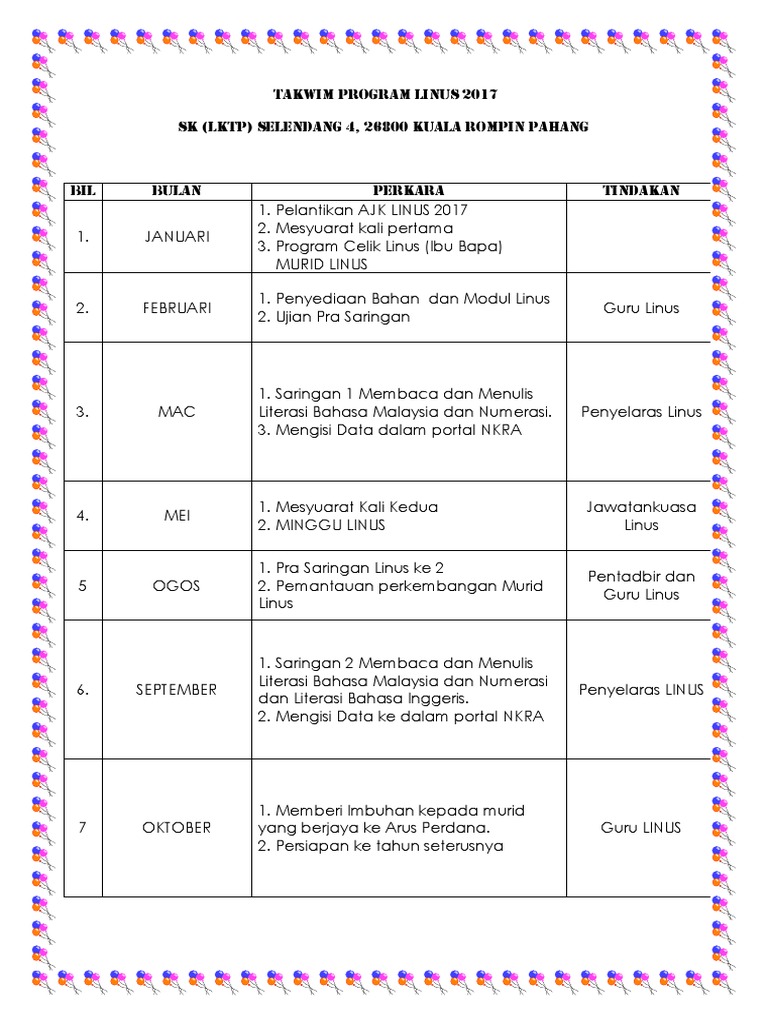 Mohon penyelaras mengemaskini data saringan 1 mengikut tempoh yang ditetapkan. Borang kehadiran murid ke hoki mini olimpik 2017 2. Kepada guru besar pengisian linus untuk saringan 2 akan bermula dari 12 24 julai 2010. Data hendaklah diisi mengikut jumlah murid bagi setiap kelas dalam aliran tahun 1 walaupun semuanya telah berada di aliran perdana bukan hanya yang mengambil saringan 2.