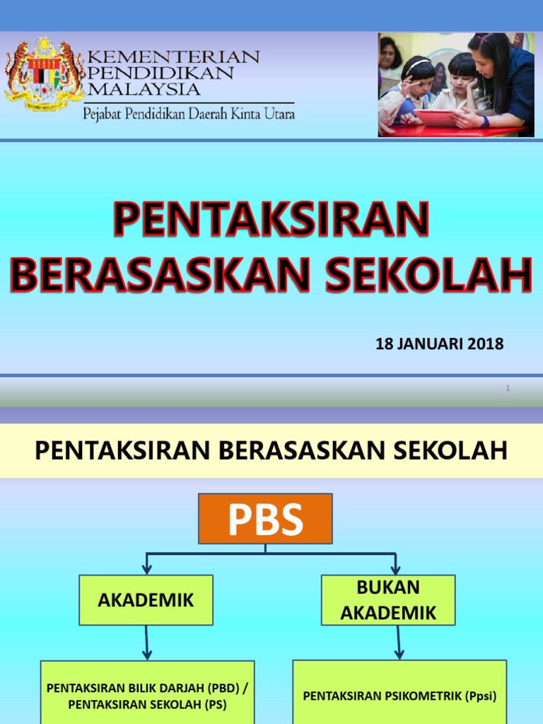 Pentaksiran berasaskan sekolah 2018. Bermula tahun ini 2018 bahagian pembangunan kurikulum kementerian pendidikan malaysia telah memuat naik templat pelaporan yang baharu yang dinamakan sebagai pelaporan pentaksiran bilik darjah pbd untuk kegunaan semua peringkat sekolah sama ada peringkat sekolah rendah kssr mahupun sekolah menengah kssm. Guru dalam panitia yang sama juga melakukan moderasi perbincangan sesama mereka dalam melakukan pertimbangan profesional terhadap murid. Pemakluman pentaksiran berasaskan sekolah pbs di sekolah rendah dan menengah rendah kp lp 003 07 14 05 1 bertarikh 29 julai 2011. Pentaksiran sekolah ps merupakan satu proses mendapatkan maklumat tentang perkembangan murid yang dirancang dilaksana dan dilapor oleh guru sekolah yang berkenaan.