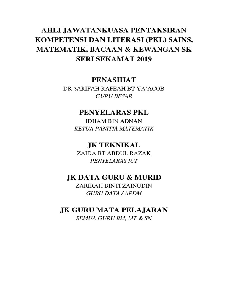 Ahli Jawatankuasa Pentaksiran Kompetensi Dan Literasi Pkl Sains Matematik Bacaan Kewangan Sk Seri Sekamat 2019 Docx