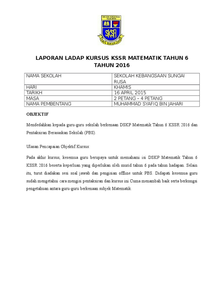 Laporan Ladap Kursus Kssr Matematik Tahun 6 Tahun 2016