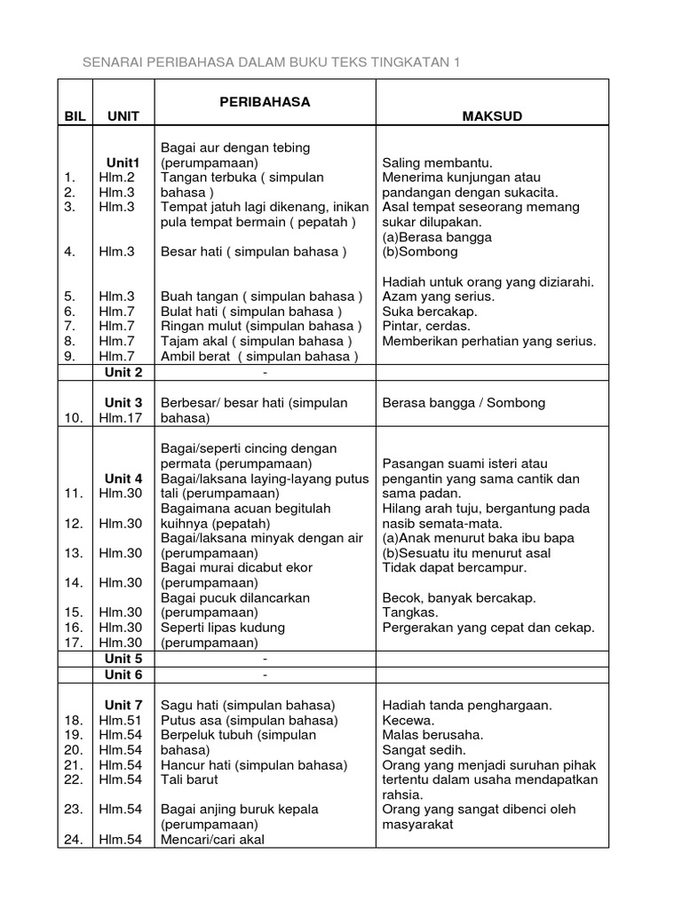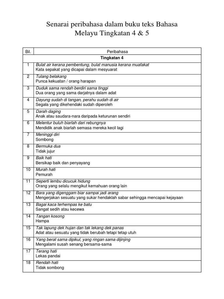 Hubungan yang rapat antara sama sama yang lain dan saling membantu. Senarai peribahasa yang terdapat di dalam buku teks tingkatan 4 bil peribahasa maksud 1 bulat air. Peribahasa buku teks bahasa melayu tingkatan 1 m s 1 20 1 bagai aur dengan tebing m s 2 saling membantu dan bekerjasama 2 besar hati m s 7 berasa bangga atau sombong 3 bulat hati m s 7 azam yang teguh 4 buah tangan m s 7 hadiah untuk orang yang diziarahi 5 ringan mulut m s 7 suka bercakap 6 tajam akal m s 7 pintar dan cerdas 8 ambil berat m s 7 memberi perhatian yang serius 9 tangan terbuka m s 3 menerima kunjungan atau pandangan dengan sukacita 10 jauh lagi dikenang inikan. 1 putus asa.