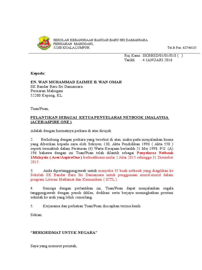 Contoh Surat Lantikan