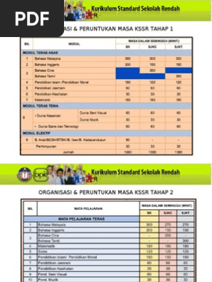 Reka bentuk teknologi dan teknologi maklumat komunikasi masih berkongsi waktu pengajaran dengan perlu diajar bergilir gilir. Mata pelajaran peruntukan masa minimum jam setahun kssr semakan 2017 tahun 1 2 3 bermula tahun 2017 murid tahun 1 akan mempelajari sukatan pelajaran kssr semakan 2017. Peruntukan waktu pendidikan jasmani kesihatan ialah 1 5 jam seminggu. Portal rasmi kementerian pendidikan malaysia.