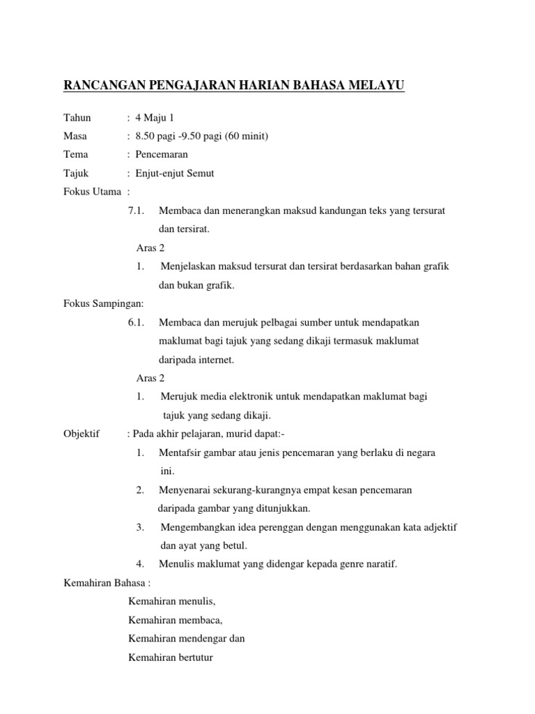 Doc Rancangan Pengajaran Harian Bahasa Melayu Tahun 1 Mem Mm Academia Edu