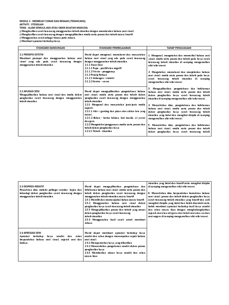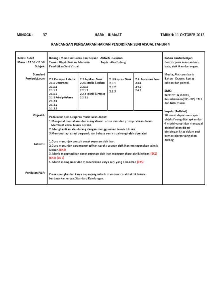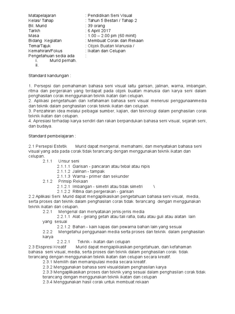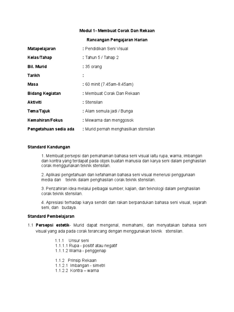 Doc Rancangan Pengajaran Harian Pendidikan Seni Visual Bil Perkara Dyana Nonong Academia Edu