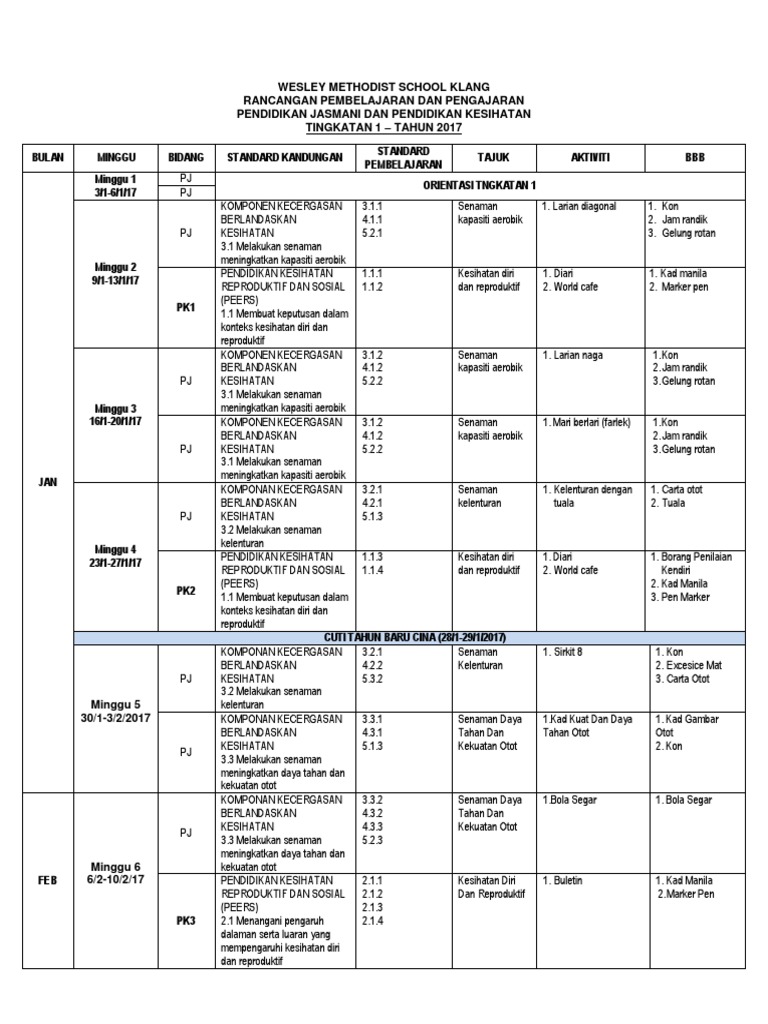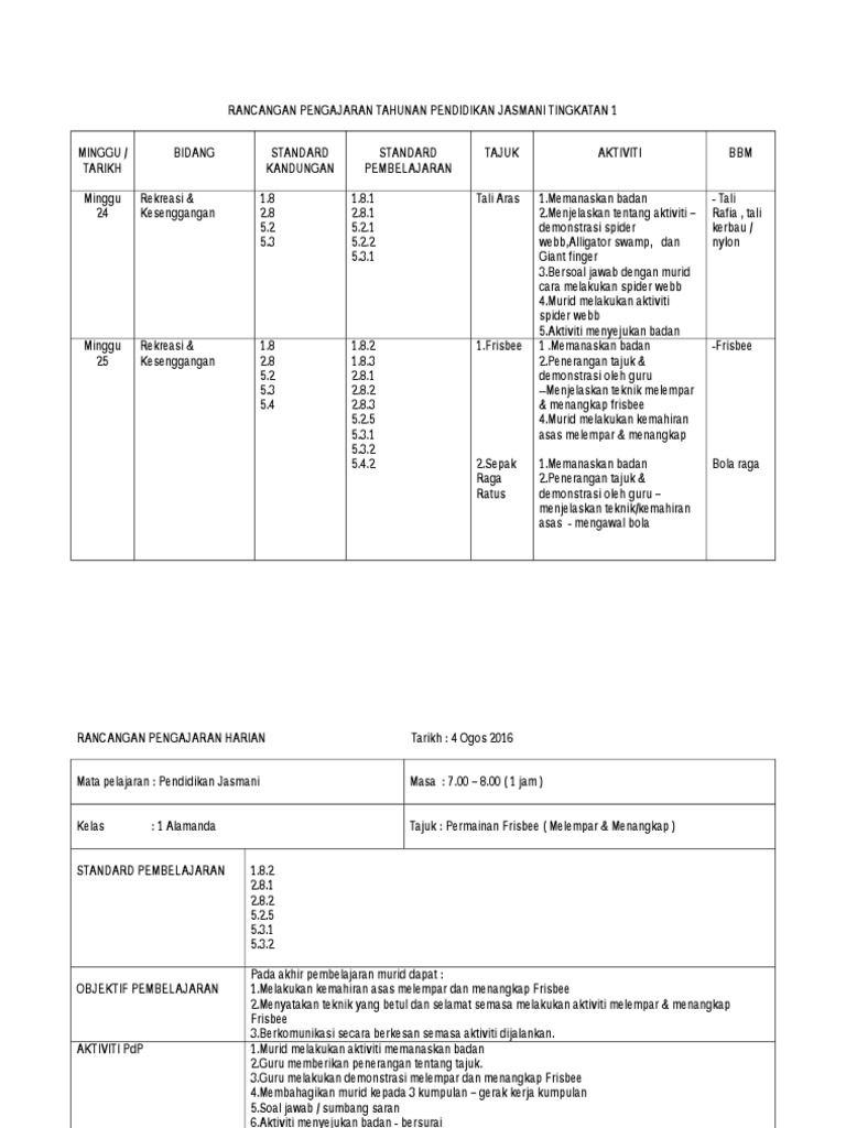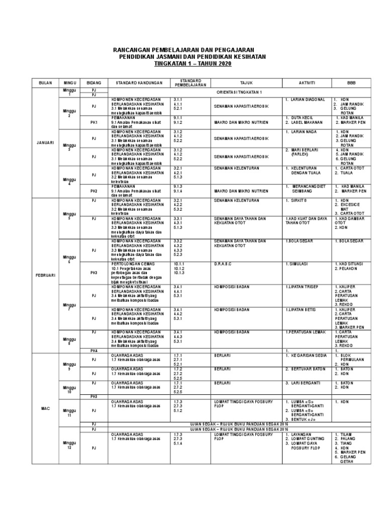 Contoh Rancangan Pengajaran Tahunan Pendidikan Jasmani Tingkatan 1 Kssm