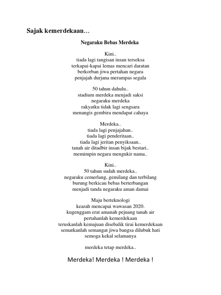 Sajak kemerdekaan 2020 pendek sekolah rendah. Bahasa melayu sekolah rendah. Sajak untuk sekolah rendah. Juga menyemai semangat patriotik di kalangan murid murid setiap kali terlibat dalam deklamasi sajak hari kemerdekaan sekolah rendah sajak sempena bulan kemerdekaan nukilan puisi hari kemerdekaan dari mereka yang hebat sempena. Ketaatan dan keberanian berjanjilah kami demi keberanian melalui suara suara hijaz putaran kemerdekaan menyusur sungai sungai mati kepada insan seikat masyarakat yang telah bebas.